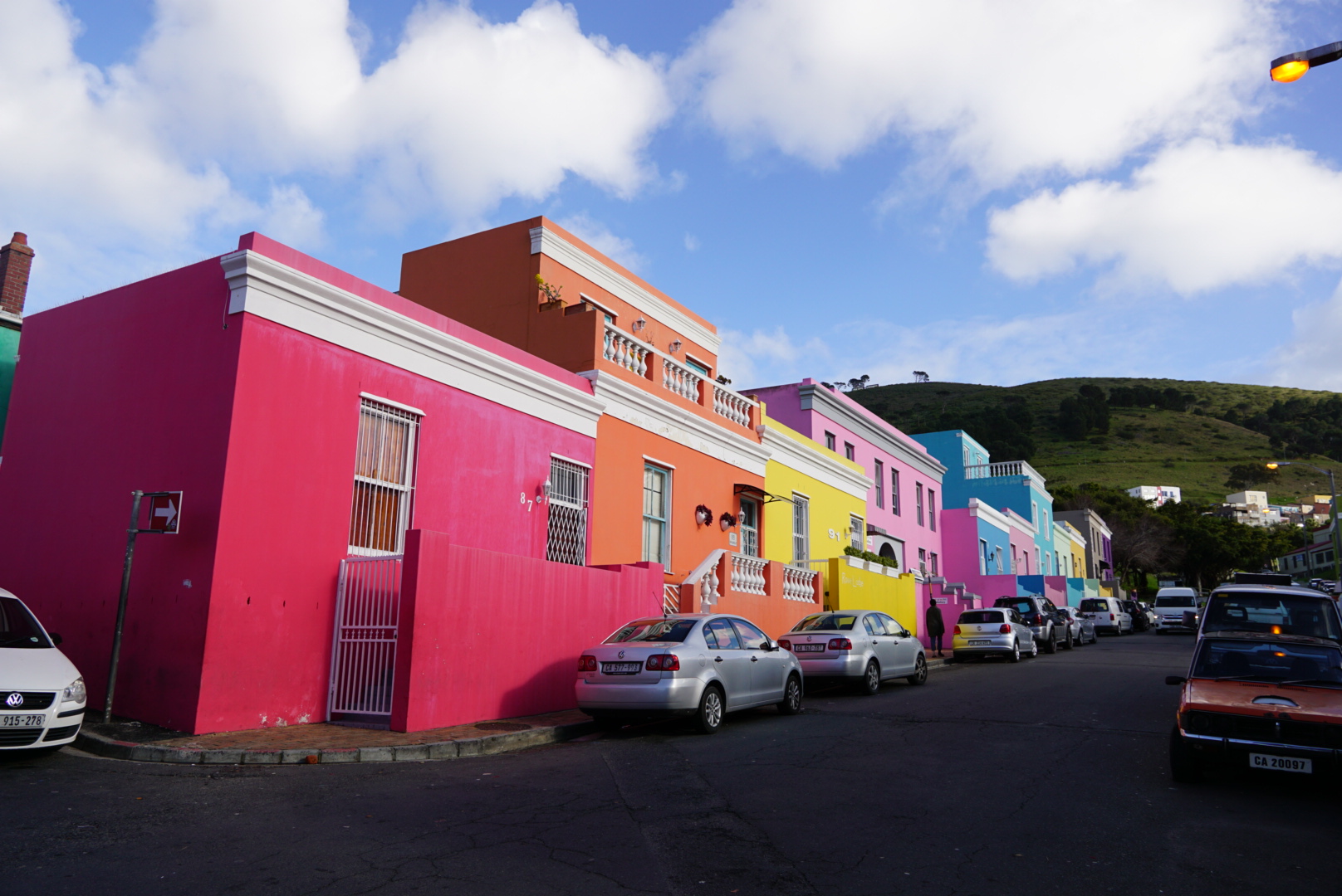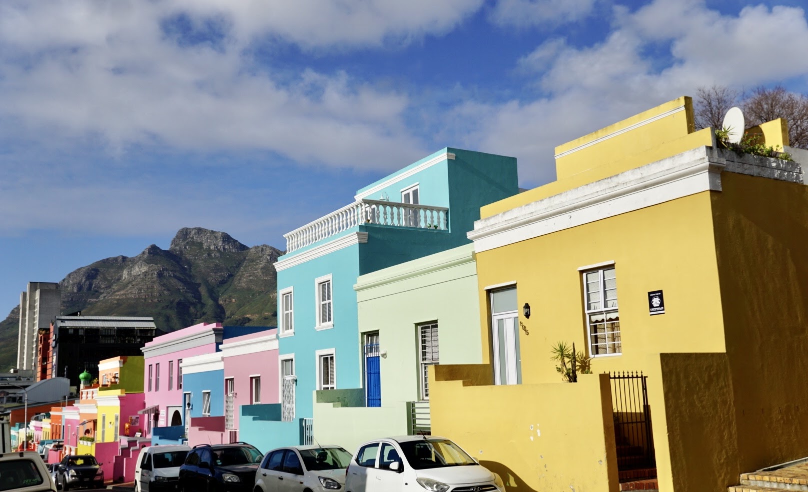 After Table Mountain, we went to the Bo-Kaap area of town. Here is a brief history of the area. “The Bo-Kaap’s origins date back to the 1760s when numerous “huurhuisjes” (rental houses) were built and leased to slaves. These people were known as Cape Malays, and were brought from Malaysia, Indonesia and the rest of Africa to work in the Cape. To this day, the houses are a mix of Cape Dutch and Georgian architecture, in distinctive multi-coloured rows on steeply cobbled roads. The choice of colour is said to be attributed to the fact that while on lease, all the houses had to be white. When this rule was eventually lifted, and the slaves were allowed to buy the properties, all the houses were painted bright colours by their owners as an expression of their freedom. Many of the families in the Bo-Kaap have been living there for generations“ ( https://www.capetown.travel/getting-to-know-the-bo-kaap).